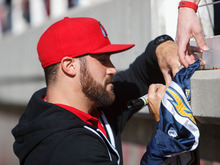 Former Utah player Eric Weddle, now in the NFL, signs a jersey for a fan as Utah hosts Wash