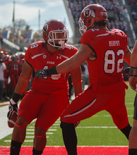 Utah fullback Max Moala (48) celebrates his touchdown with teammate Utah tight end Jake Murphy (82) as Utah hosts Washington State, college football at Rice-Eccles Stadium Saturday November 3, 2012 in Salt Lake City.