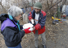 He jumped out of the van and into the blizzard to find out what he could do for them, leaving a bundled Pamela Atkinson in the back seat working a smartphone in search of aid for a needy family she'd just learned about from a state Capitol contact. The two advocates had already delivered hot roast-beef dinners to their homeless friends at a settlement of tents and huts along a Salt Lake Valley creek. They still had a few stops to go.