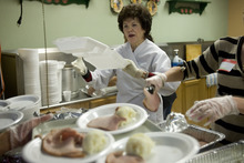 On the serving line, Jeannie Johnson put hunks of turkey breast on throwaway plates that the serving crew heaped with potatoes, gravy and corn before bringing them to tables filled with guests. She used to spend Christmas alone but now celebrates holidays volunteering here all day.