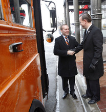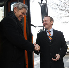 The 38-year-old Democrat rode to the 9 a.m. inauguration ceremony on the "Ben Bus," accompanied by many of the valley's Republican mayors who took seats on the bus in his election campaign ads, signifying their support for McAdams and his pledge to work with people of all political persuasions, young and old, from all parts of the county.