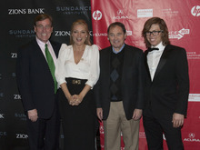 Kevin Pearce, right, and director Lucy Walker are joined by Zions Bank president Scott Anderson, left, and Utah governor Gary Herbert at the red-carpet premiere of "The Crash Reel," at the Rose Wagner Performing Arts Center Friday January 18, 2013 in Salt Lake City, Utah. The movie is a documentary about former Utah snowboarder Kevin Pearce, who suffered brain injury in a crash. Steve Griffin | The Salt Lake Tribune