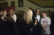 Kevin Pearce is held up by his friends at the red-carpet premiere of "The Crash Reel," at the Rose Wagner Performing Arts Center Friday January 18, 2013 in Salt Lake City, Utah. The movie is a documentary about former Utah snowboarder Kevin Pearce, who suffered brain injury in a crash. The film's director director Lucy Walker is at left. Steve Griffin | The Salt Lake Tribune