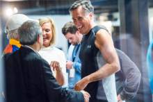 Mitt Romney jokes around before weighing in at Xcel Fitness Thursday May 14, 2015. Romney will fight former heavyweight boxing champion Evander Holyfield in the marquee event Friday night at the Rail Event Center near the Union Pacific Depot in Salt Lake City on May 15.