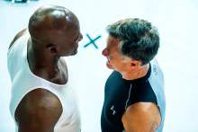 Mitt Romney and former heavyweight boxing champion Evander Holyfield square off after weighing in at Xcel Fitness Thursday May 14, 2015 .Romney will fight former heavyweight boxing champion Evander Holyfield in the marquee event Friday night at the Rail Event Center near the Union Pacific Depot in Salt Lake City on May 15.