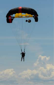NASA Ambassador Patrick Wiggins, 66, is no stranger to the sky with about 760 jumps under his belt. On Friday the education assistant at the University of Utah donned his original 1965 "antique parachute" and gear to mark the 50th anniversary of his first jump while joining friends at Skydive Utah, at the Tooele Valley Airport in Erda.