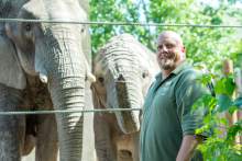 Elephant Manager Eric Peterson poses for a portrait with Christie and Zuri at Utah's Hogle