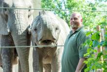 Elephant Manager Eric Peterson poses for a portrait with Christie and Zuri at Utah's Hogle Zoo Wednesday June 3, 2015.
