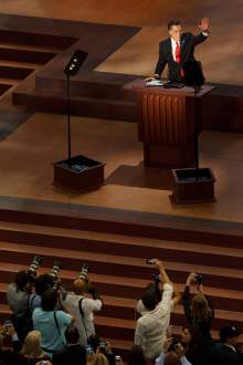 Not that the networks had the best view anyway. The media platform was too high, leaving most cameras pointed down at Huntsman so that his background was not the famed symbol of America but a Circle Line tour boat docked on Liberty Island.