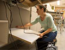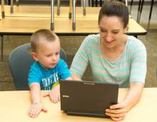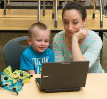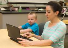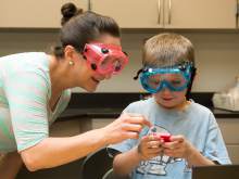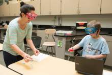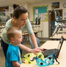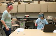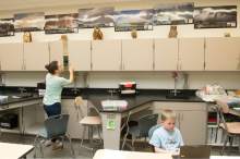 In the lab • While organizing her Kaysville classroom for summer break, Centennial Junior High teacher Angela Stewart pauses to do an experiment with sons Davis, 7, and Kimball, 3.