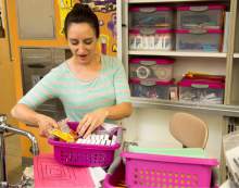 In her classroom, decorations include an illustrated poster of the prehistoric world complete with humankind's evolutionary ancestors and a smiling planet Earth encouraging conservation.
