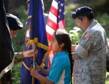 Native American children participate in a flag ceremony with their elders who served in the a