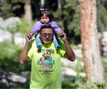 Andrew Tso carries his granddaughter Macy Little on a nature walk at the Native American Church of North America's Youth Conference, part of its national conference at Redman Campground in Little Cottonwood Canyon Thursday June 18. The conference is expected to have 400 Native American children and their families attend the conference, which includes members from around the country and Canada.