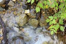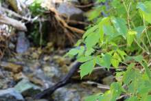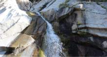 The shady, dirt trail ascends the north side of the canyon through high-reaching greenery, with a rock-strewn stream bed to your left. Don't let its dry looks fool you the hike lives up to its name before long. After you pass a large boulder on your right, the trees open up to the rocky base of the falls.