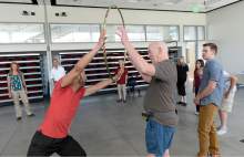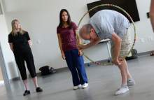 Swenson teaches the student volunteers from the modern dance and physical therapy departments how to take vital signs and watch for exhaustion in the dancers.