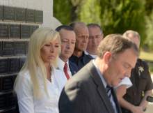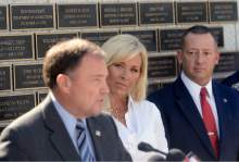 Plaques bearing the names of dozens of such law officers adorned the stone wall behind the governor. On the opposite side from Wride's name was that of Draper Police Sgt. Derek Johnson, who was shot and killed in 2013. His widow, Shante, lobbied with Nannette Wride to pass HB288.