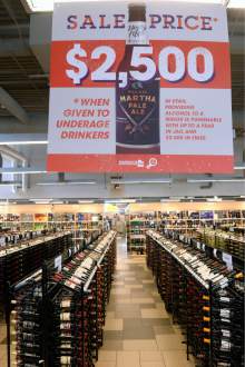 Posters and tags hanging from liquor bottles remind patrons of the legal and financial costs of supplying alcohol to those who are underage at the Utah State Liquor Store at 1814 E. Murray Holladay Road on Thursday July 2.