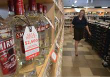 Posters and tags hanging from liquor bottles remind patrons of the legal and financial costs