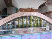 The hall features wind chimes, a coat and hat-check counter, an elevated stage where Van De Vanter sometimes staged puppet shows with his own hand-carved wooden creations, and a small orchestra stage.