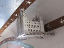 A big mirrored ball with a carving of the Salt Lake Temple of the LDS Church on top. Tracks where an electric train once ran. An airplane pulling a banner reading, "We dance next Saturday." More sculptures and thousands of mirrors.