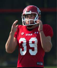 University of Utah kicker Andy Phillips lines up a field goal attempt during football practice on the University of Utah baseball field in Salt Lake City, Monday, August 18, 2014.