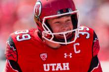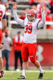 Utah Utes place kicker Andy Phillips (39) smiles after one of his kicks goes into the end z