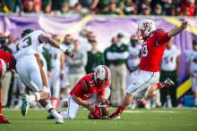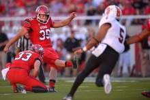 Andy Phillips celebrates a field goal at the Utah Football Red & White game in Salt Lak