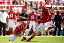 Quarterback Andy Phillips lines it up with the help of fellow kicker Tom Hackett as the University of Utah football team gets ready for the season during Spring practice at the Spence Eccles Football Facility on Thursday, April 17, 2014.