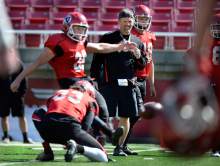 Utah head coach Kyle Whittingham watches as K Andy Phillips practices field goal kicki