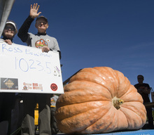 The Utah Giant Pumpkins Growers weigh a giant pumpkin at the annual pumpkin weigh-off at Thanksgiving Point on Saturday, September 28, 2013. Ross and Kaye Bowman's was not the largest of the day but he has grown 5 pumpkins weighing more than 1000 lbs, in the past three years.