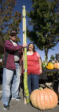 Ralph and Juana Laub, display their 106 1/2 inch gourd they grew in Vernal, at the Utah Giant Pumpkins annual pumpkin weigh-off at Thanksgiving Point on Saturday, September 28, 2013. Their gourd was the tallest gourd in todays competition.
