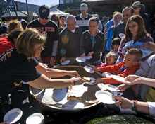 Pie lovers crowd around a giant pumpkin pie, at the Utah Giant Pumpkins annual pumpkin weigh-
