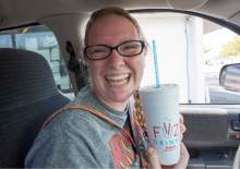 Pakalawi holds up her current "Frequent Swigger" punch card which rewards her with a free drink for every 10 she buys. This is her 205th card, meaning she's downed more than 2,000 Swig drinks since the Lehi location opened last year.