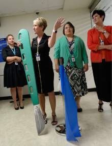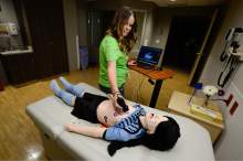 Primary Children's Hospital simulation coordinator Brenna Thomas uses ultrasound to detect any possible injuries in a child as Intermountain Healthcare shows off the state's largest and most advanced medical simulation center at LDS Hospital in Salt Lake City. The center is equipped with advanced simulation technology that allows staff the opportunity to develop and practice physical skills, critical thinking, decision-making, collaboration, and communication in a safe, realistic environment.