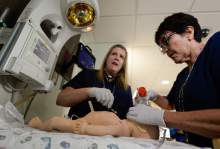 New born intensive care nurses, Luann Westerman, left, and Mary Jane McGregor run through a new born delivery scenario as Intermountain Healthcare shows off the stateís largest and most advanced medical simulation center at LDS Hospital in Salt Lake City. The center is equipped with advanced simulation technology that allows staff the opportunity to develop and practice physical skills, critical thinking, decision-making, collaboration, and communication in a safe, realistic environment.