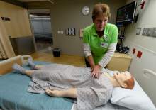 RN Dalene Cummings of the Dixie South West Region does a compression simulation on a dummy as Intermountain Healthcare shows off the state's largest and most advanced medical simulation center at LDS Hospital in Salt Lake City. The center is equipped with advanced simulation technology that allows staff the opportunity to develop and practice physical skills, critical thinking, decision-making, collaboration, and communication in a safe, realistic environment.