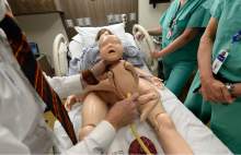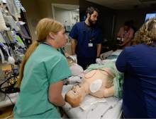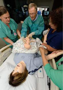Delivery nurse Kendra Michaelis, Dr. Doug Richards, and RN Melissa Baker, from left, perform a simulation birth as Intermountain Healthcare shows off their new medical simulation center at LDS Hospital in Salt Lake City. The center is equipped with advanced simulation technology that allows staff the opportunity to develop and practice physical skills, critical thinking, decision-making, collaboration, and communication in a safe, realistic environment.