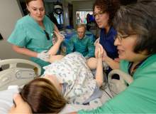 Delivery nurse Kendra Michaelis, Dr. Doug Richards, RN Melissa Baker and Lisa Hubert, from left, perform a simulation birth as Intermountain Healthcare shows off their new medical simulation center at LDS Hospital in Salt Lake City. The center is equipped with advanced simulation technology that allows staff the opportunity to develop and practice physical skills, critical thinking, decision-making, collaboration, and communication in a safe, realistic environment.