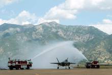 Nine minutes later, the first F-35 landed on the runway. Fire trucks sprayed water into the air to form a liquid arch as the jet taxied to a crowd of a couple hundred Air Force officers, enlisted personnel, civilians and journalists attending a welcoming ceremony.