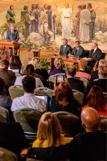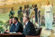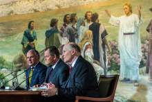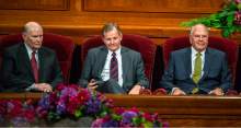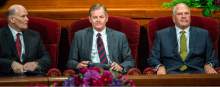 Just after millions of Mormons raised their right hands to "sustain" all the top church leaders, the new men quietly took their places in the plush red seats on the dais in the giant Conference Center in downtown Salt Lake City, where thousands were gathered for the third session of the 185th Semiannual LDS General Conference.