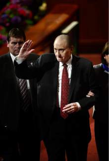 Thomas S. Monson • The LDS Church president, delivering his first address this weekend to the general membership of the faith, welcomed three new apostles as he opened the Sunday morning session and mourned the loss of the three men they replaced.