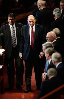 Near the end of his sermon, Monson appeared to grow weak at the pulpit and his voice started to trail off. He finished his talk and was helped to his seat.