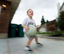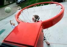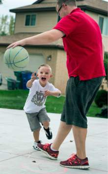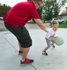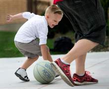 Her son giggles as he swipes at the ball, trying to steal it away from his father's hands. He laughs again as he races toward the hoop for a layup, and later again as he works on his post moves, using his tiny body to back his dad under the rim.