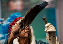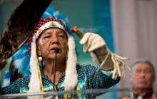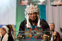 Chiefs from seven American Indian tribes, wearing traditional feathered headdresses and fur cloaks, led the way to the podium as a drum circle accompanied their steps.