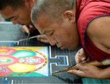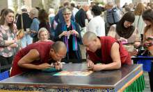 Buddhist monks from the Drepung Loseling Monastery create an intricate Mandala sand painting
