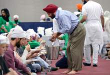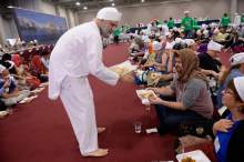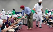 Tarlochan Gill of Salt Lake City greets the several thousand attending the Parliament of the World's Religions "Langar" at the Salt Palace Convention Center Friday, Oct. 16. Dozens of members of the Sikh religion served the conference attendees sitting together on the floor in the 500-year-old Sikh religion tradition where vegetarian food is served to all for free, regardless of religion or class. Langar expresses the ideals of community, sharing and oneness of mankind.