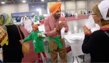 Tarlochan Gill of Salt Lake City greets the several thousand attending the Parliament of the