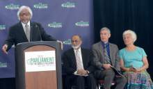Dr. Arun Gandhi, 5th Grandson of Mohandas Gandhi, Author, President of the Board, Gandhi Worldwide Education Institute, Trustee, Parliament of the World's Religions speaks at press conference Tuesday Septmember 9 for Parliament of the World Religions, announces that the global interfaith gathering has chosen Salt Lake City for its October 2015 meeting. Further right are: Imam Abdul Malik Mujahid, Chair, Parliament of the World's Religions Board of Trustees, Andrew Himes, Executive Director, The Charter for Compassion International, and Dr. Mary Nelson, Executive Director, Parliament of the World's Religions.