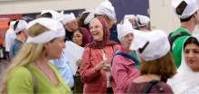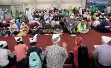 Participants at theParliament of the World's Religions talk and wear obligatory head coverin