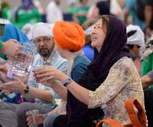 Participants at theParliament of the World's Religions talk and wear obligatory head coverings while waiting to be seated and served food at a traditional Langar. Langar is a 500-year-old Sikh religion tradition where vegetarian food is served to all for free, regardless of religion or class. Langar expresses the ideals of community, sharing and oneness of mankind. Several thousand sat together as equals on the floor of the Salt Palace Convention Center Friday, Oct. 16 and were served by dozens of Sikh volunteers.